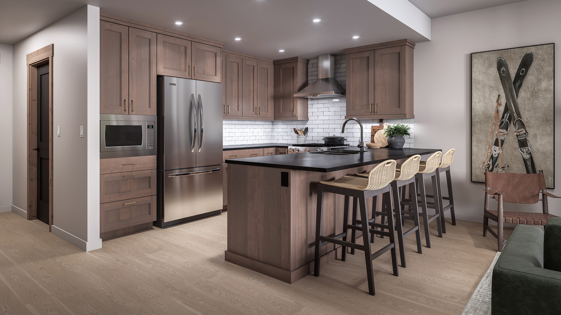 This designer kitchen blends clear alder cabinetry with a natural black glaze, brushed gold pulls, and sleek quartz countertops. Premium KitchenAid stainless steel appliances and a gas cooktop elevate both everyday living and entertaining. The island seating creates a natural hub for connection and conversation. Warm wood tones and layered textures complete the elevated rustic style of this condo.