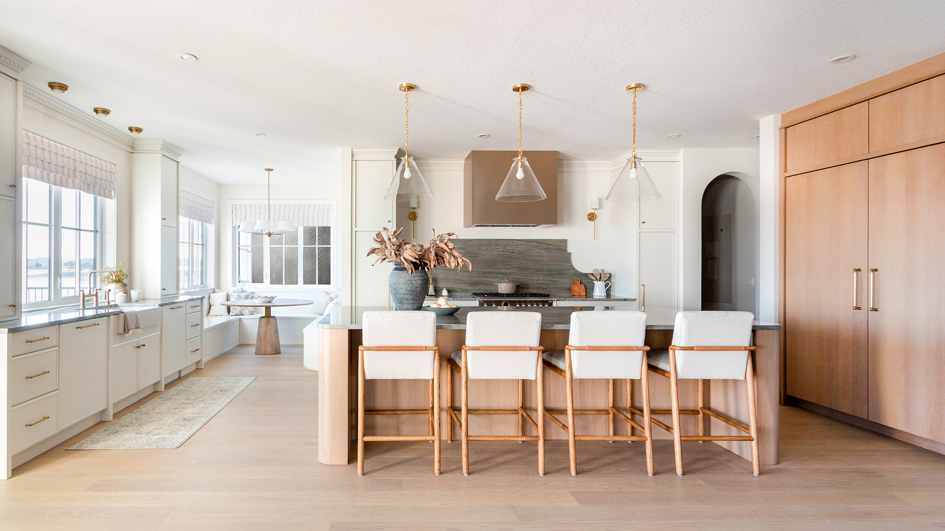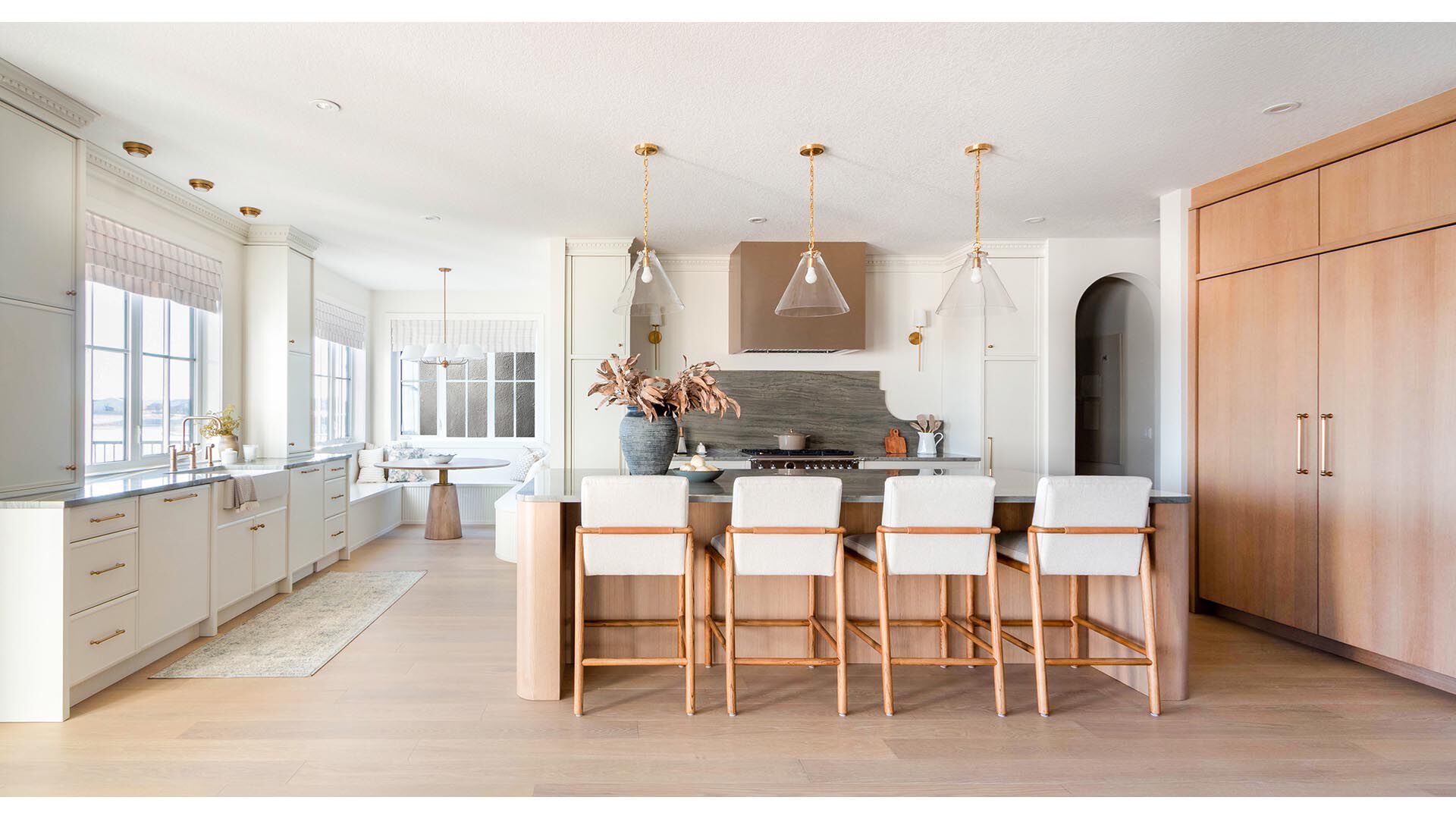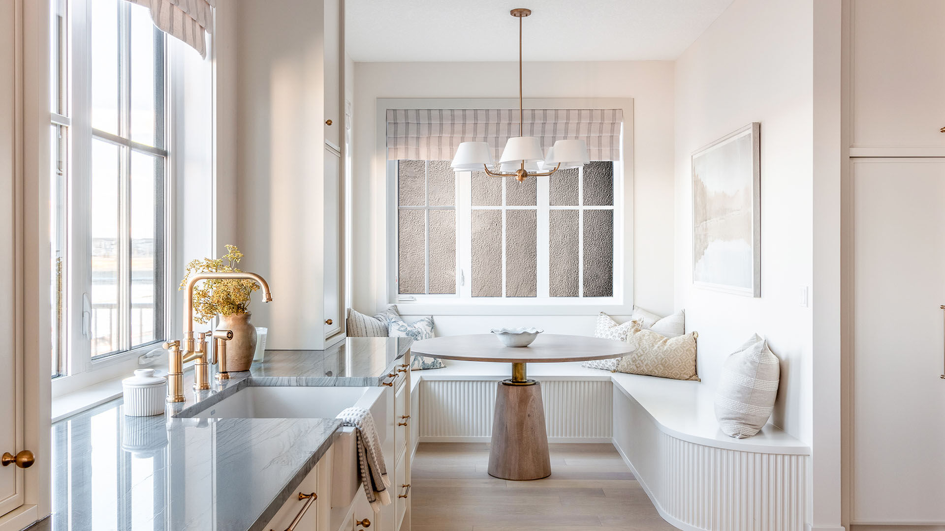 The kitchen is designed as the true gathering place, blending elegance with everyday functionality. A large island and dramatic hood fan create a stunning focal point, while bright, airy cabinetry and warm metallic accents bring a sense of refinement. The cozy breakfast nook, framed by fluted bench seating, offers a perfect spot for enjoying slow mornings with coffee and conversation. With abundant storage, generous counter space, and thoughtful details throughout, this kitchen feels both sophisticated and welcoming.
