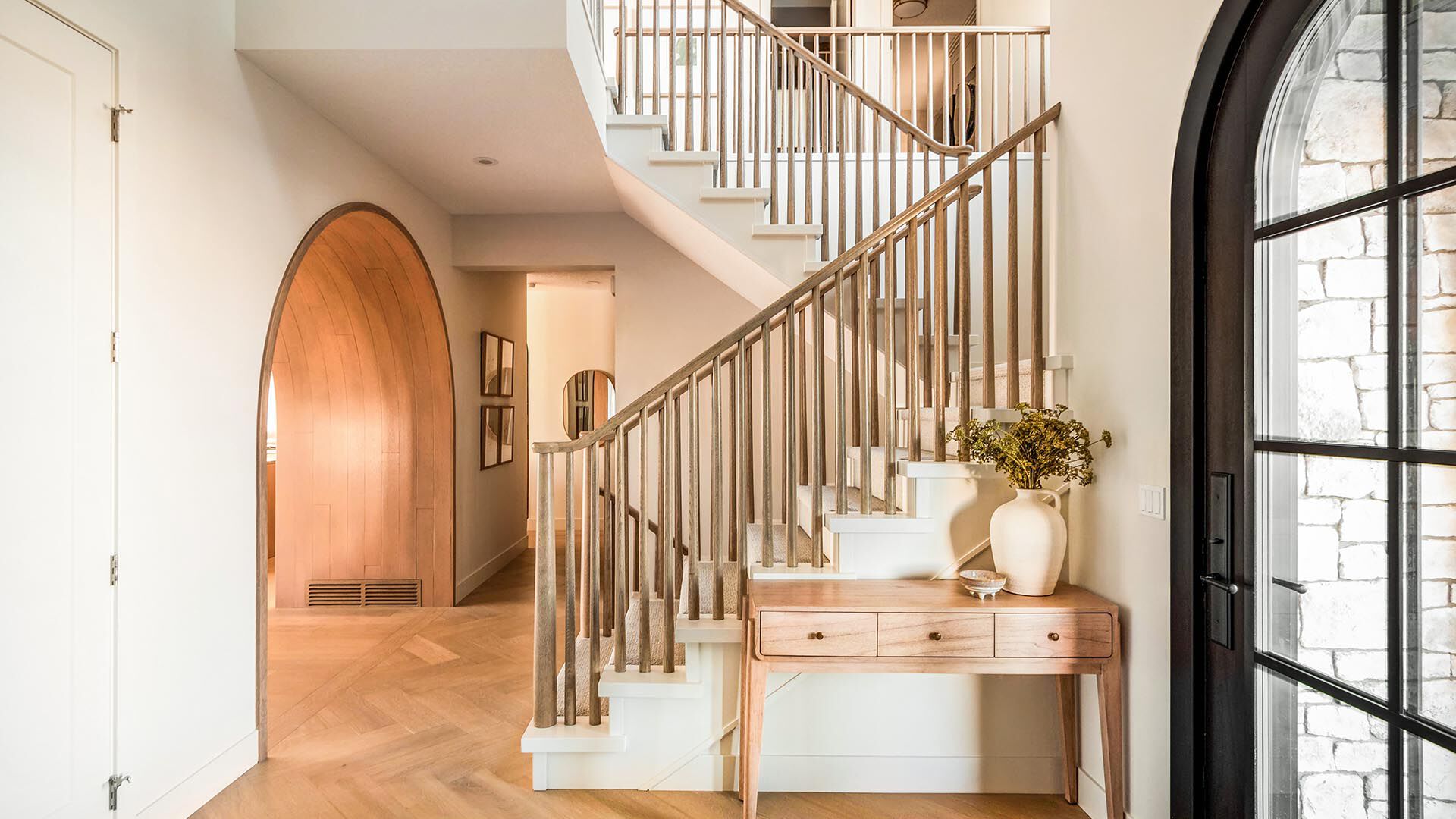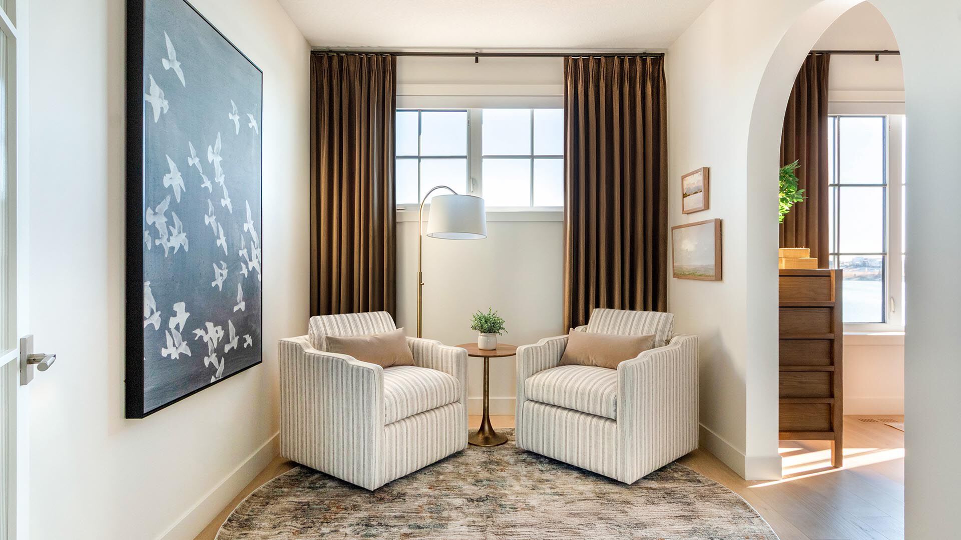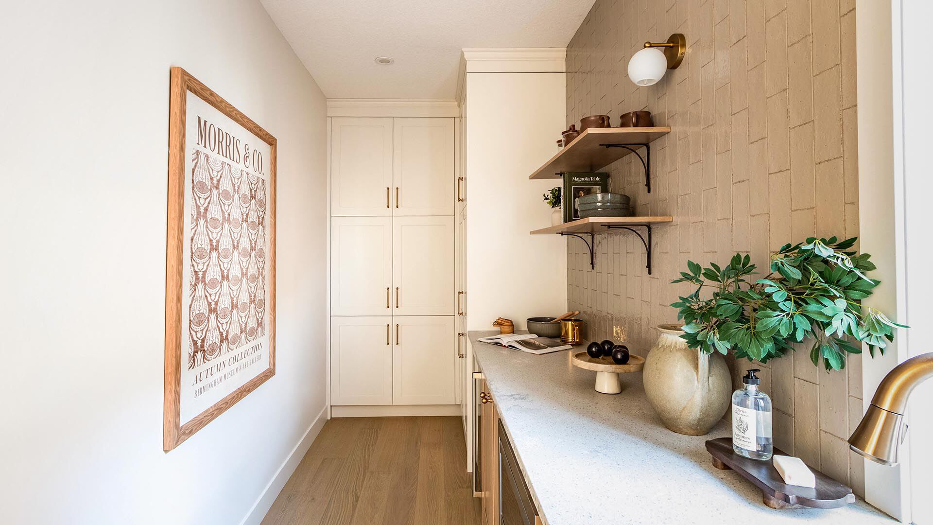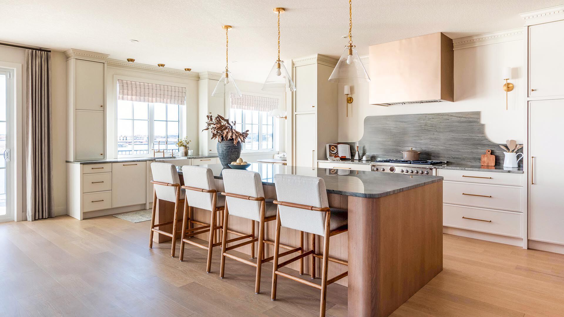 The kitchen is designed as the true gathering place, blending elegance with everyday functionality. A large island and dramatic hood fan create a stunning focal point, while bright, airy cabinetry and warm metallic accents bring a sense of refinement. The cozy breakfast nook, framed by fluted bench seating, offers a perfect spot for enjoying slow mornings with coffee and conversation. With abundant storage, generous counter space, and thoughtful details throughout, this kitchen feels both sophisticated and welcoming.