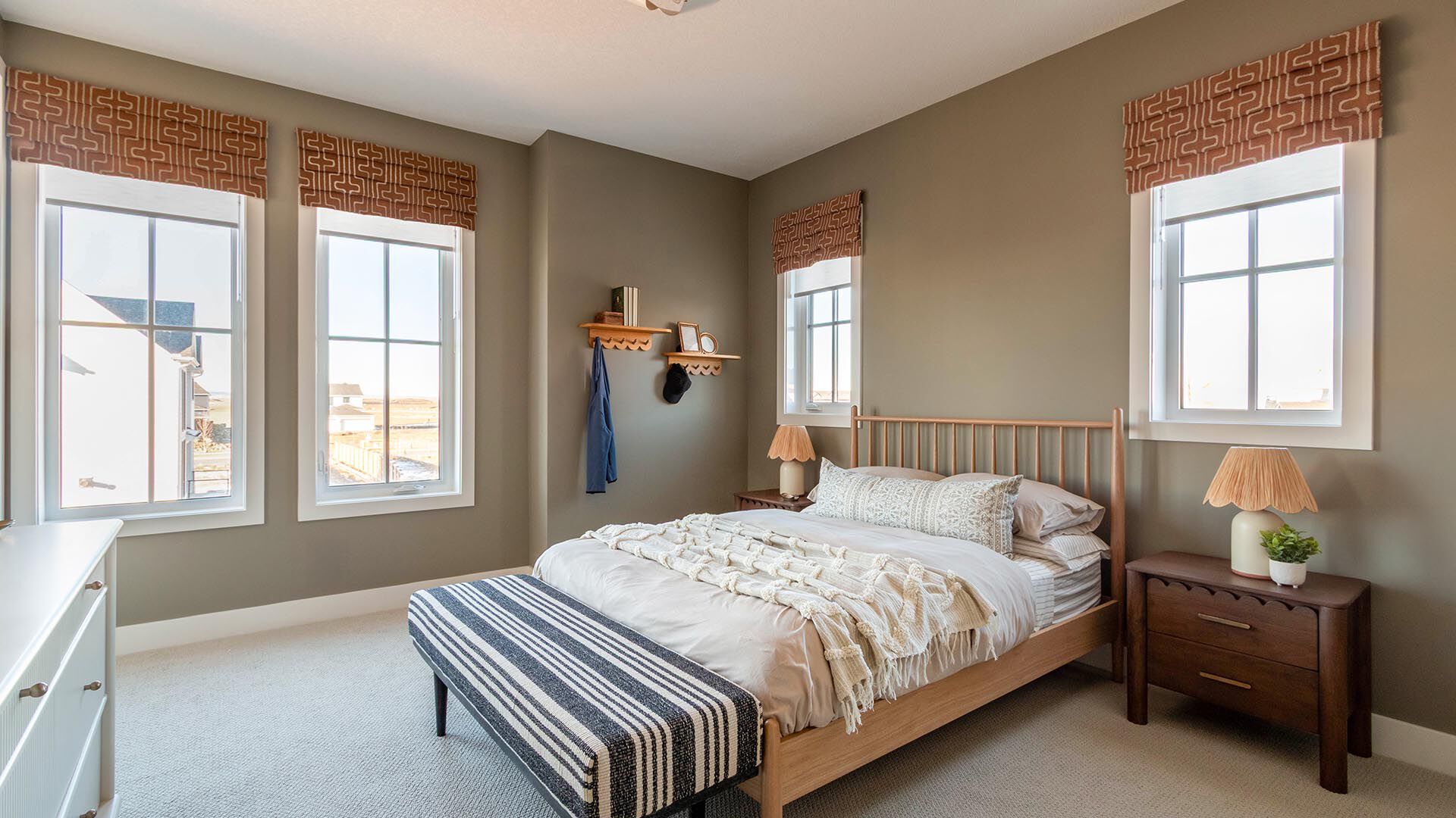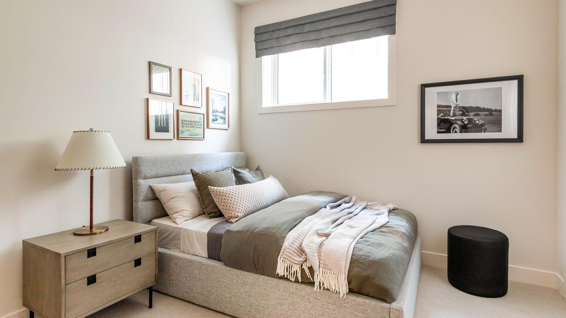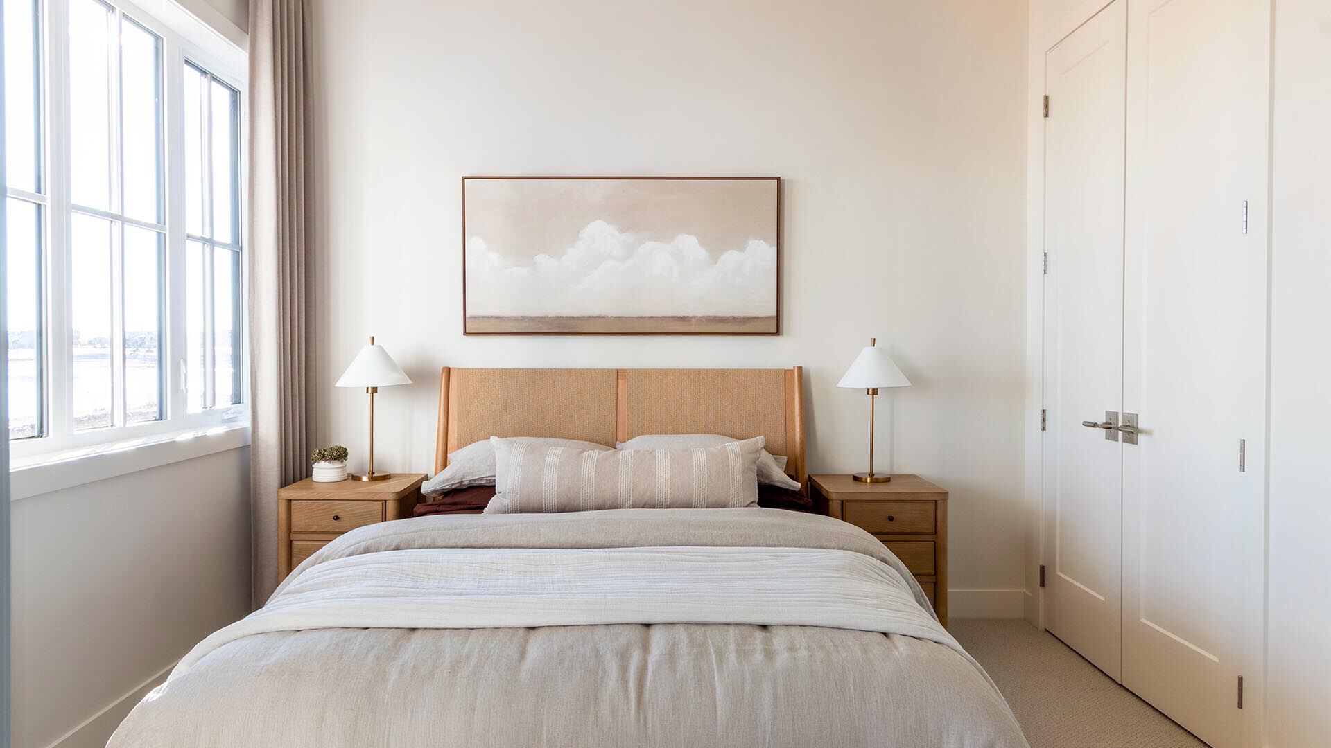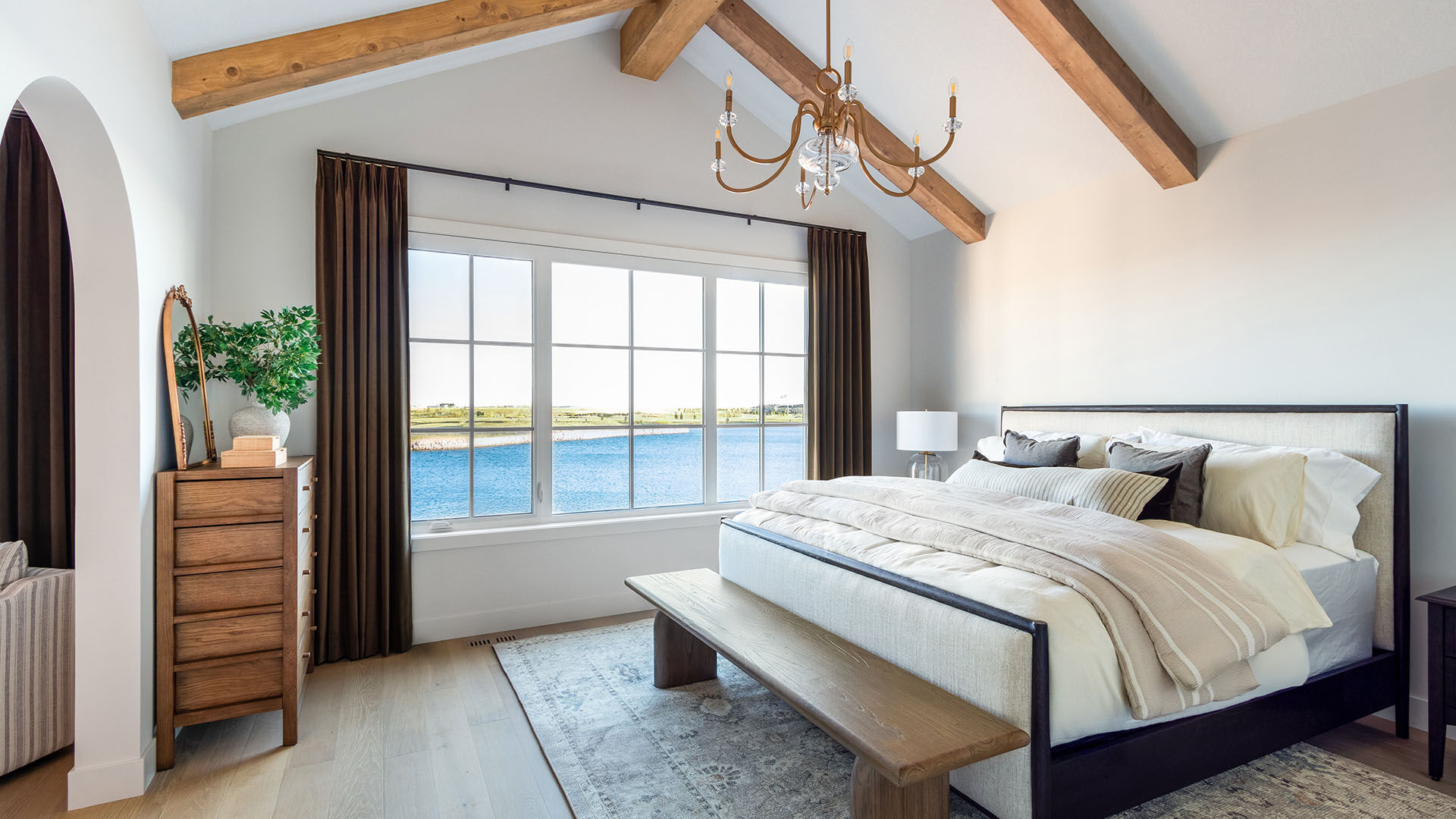 The primary bedroom offers a serene escape designed for both rest and refinement. A vaulted ceiling accented with natural wood beams adds warmth and architectural character, while soft textures and layered lighting create a calm, elevated atmosphere. Thoughtfully chosen finishes and furnishings strike a perfect balance between luxury and comfort. The adjoining ensuite and walk-in closet extend the sense of indulgence, transforming daily routines into moments of quiet retreat.