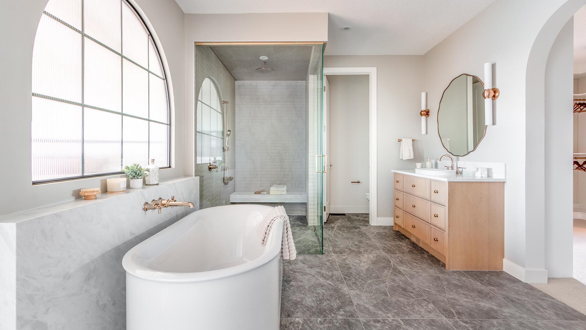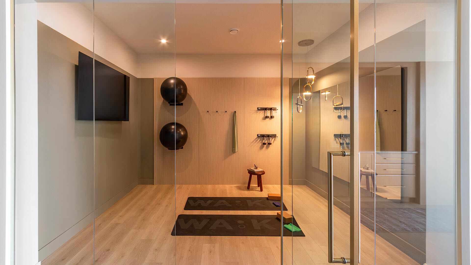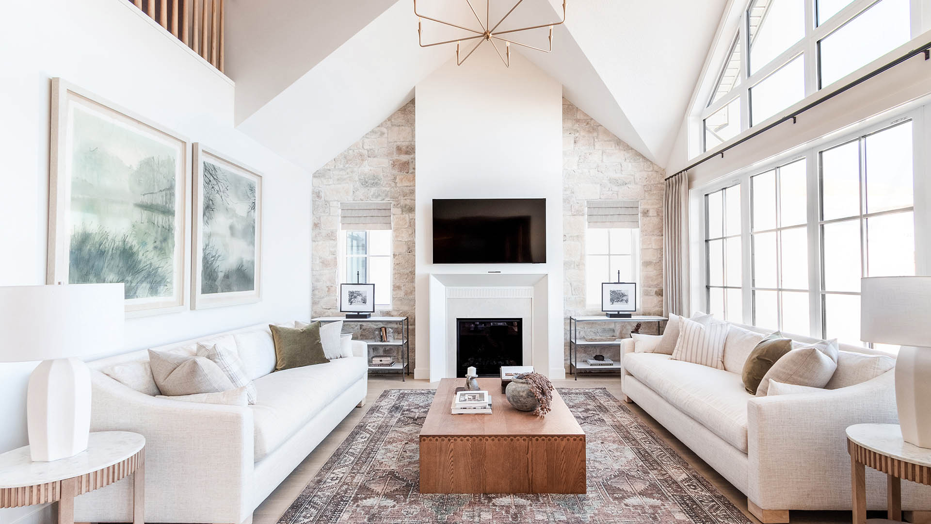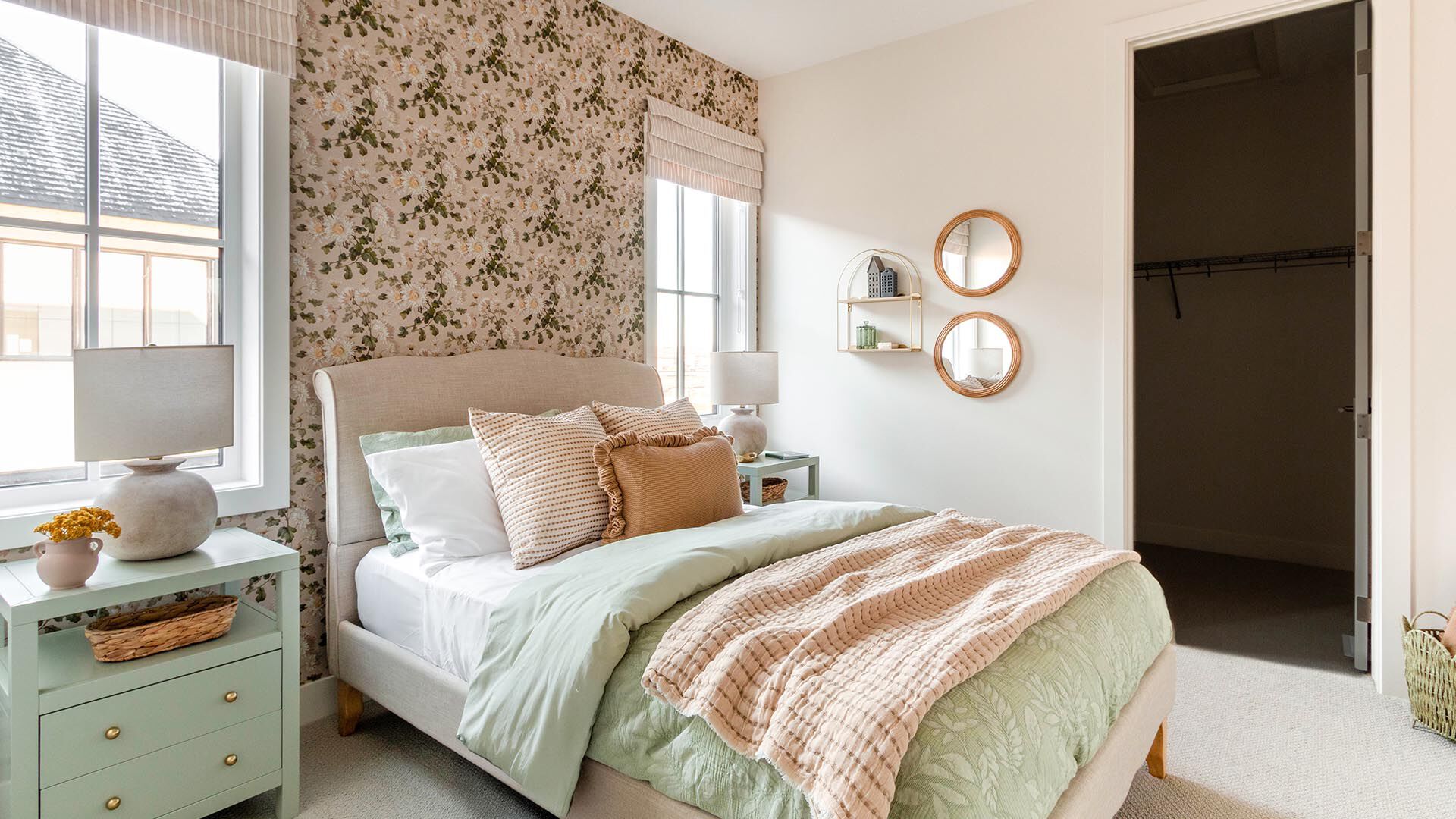 The primary bedroom offers a serene escape designed for both rest and refinement. A vaulted ceiling accented with natural wood beams adds warmth and architectural character, while soft textures and layered lighting create a calm, elevated atmosphere. Thoughtfully chosen finishes and furnishings strike a perfect balance between luxury and comfort. The adjoining ensuite and walk-in closet extend the sense of indulgence, transforming daily routines into moments of quiet retreat.